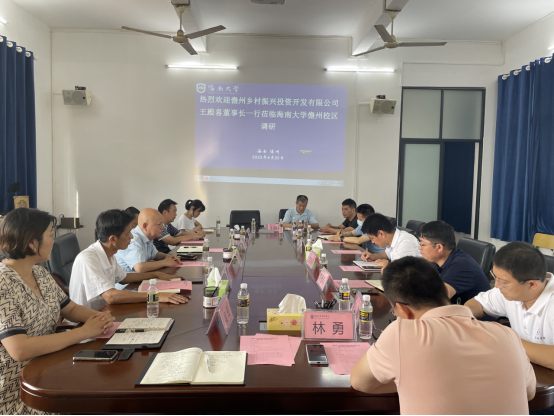 为进一步深化校企合作,实现儋州校区人才优势和企业产业优势的深入对接,4月25日下午,儋州市乡村振兴投资开发有限公司董事长兼总经理王殿喜,副总经理徐伟、吴云、梁波、总策划师李智林一行来到儋州校区,与农业农村学院、应用科技学院、林学院、园艺学院负责人开展了乡村振兴就业合作发展座谈会,会议由儋州校区管委会范启标主任主持。