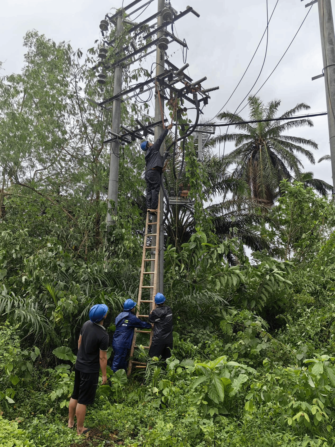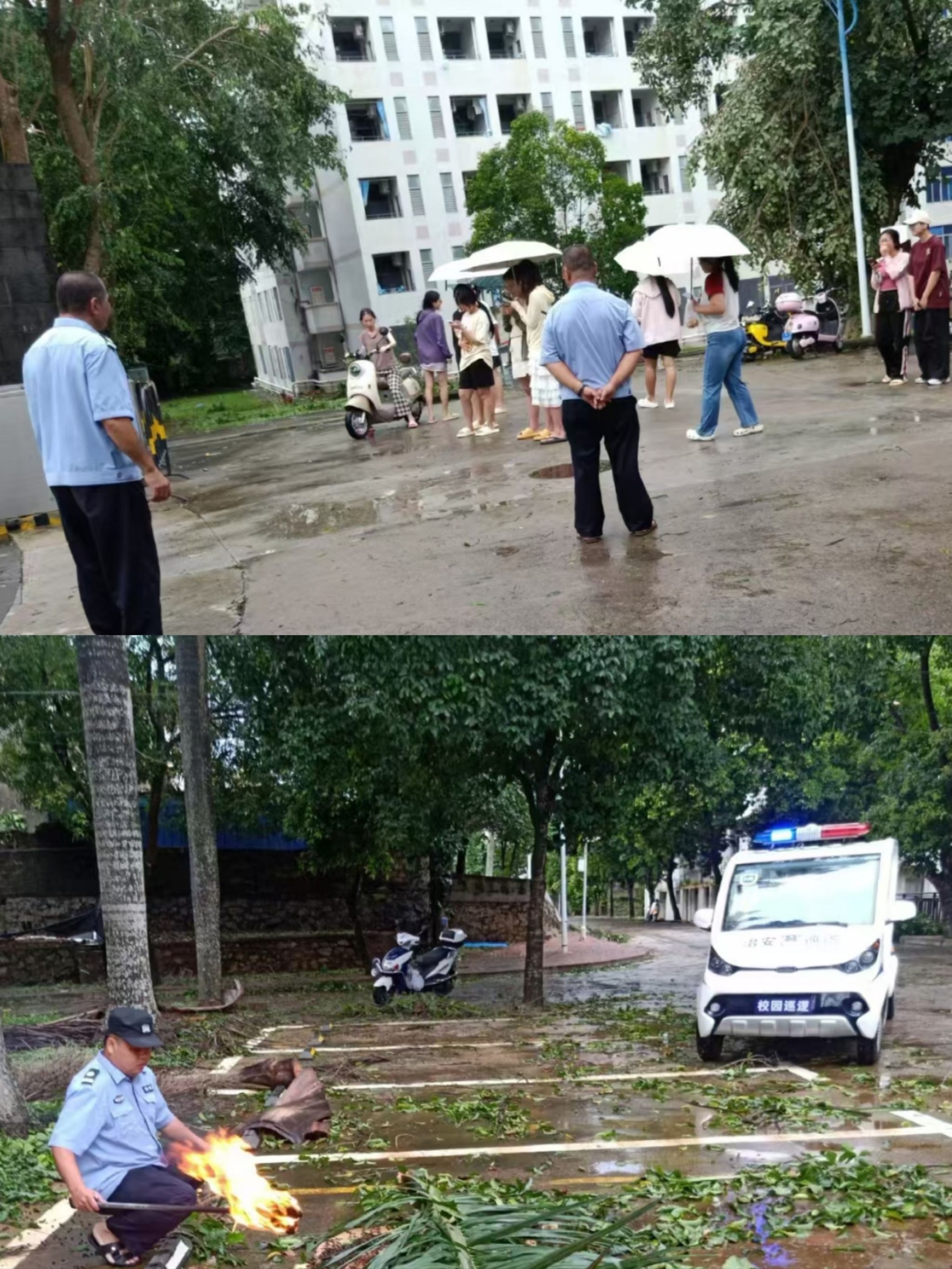 水电部门的抢修人员同样争分夺秒。台风导致部分片区的树干倒伏、电线被刮断,断电断网。抢修队伍兵分多路,对存在安全隐患和故障的线路进行全面排查和检修。他们攀爬电线杆、接驳电线,在复杂恶劣的环境中紧张地忙碌着,只为让整个校园尽快重新亮起、恢复通讯,为师生送去光明和温暖。
