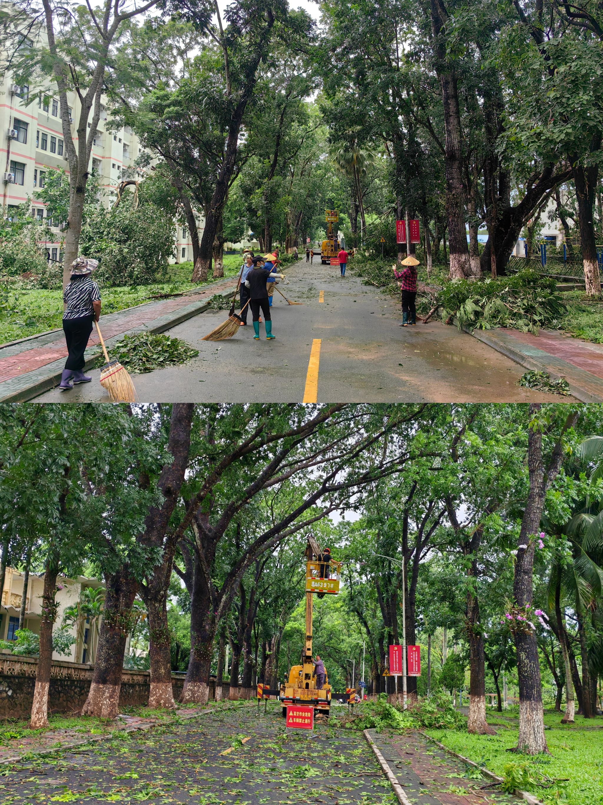 在校园的各大主干道上,园林工人们正冒着生命危险利用高空作业车和电锯等工具清理到处倒伏的树木和枯枝败叶,环卫工人们正加班加点地清理被台风吹落的树枝、垃圾和杂物。他们从清晨开始劳作,只为尽快恢复校园的整洁面貌,让师生们能够在干净舒适的环境中恢复正常学习、工作和生活。