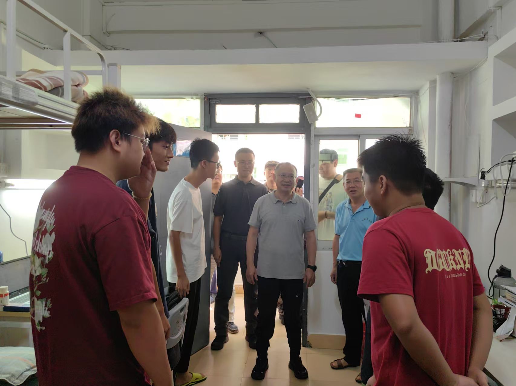 骆清铭校长一到校区,便马不停蹄地开始视察校园的每一个角落。校长先来到了研究生宿舍楼,与学生深入交流,对檀雅书院组织研究生抗台风的经验大为赞叹,极力要求推广到学校每一位师生,接着慰问了学生党员代表和预征预储班级成员退伍大学生以及国旗护卫队,随后来到学生宿舍区,与学生亲切交谈,询问台风过后的学习和生活情况。